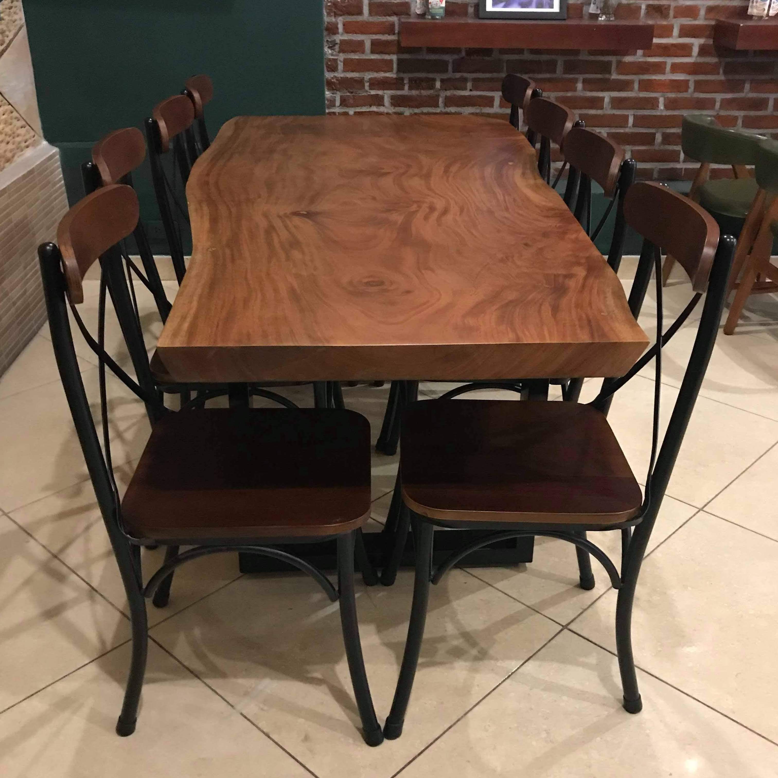 Chiếc bàn hoàn toàn phù hợp với những chiếc ghế cafe Vintage. Trong hình là mẫu ghế Bistro gỗ khung sắt. Với kích thước này, bàn nhóm dành cho 5-10 người ngồi.